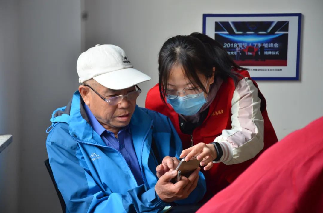烟台大学助老青年志愿者正在教社区里的老年人使用智能手机(郭嘉程 2021年10月摄)
