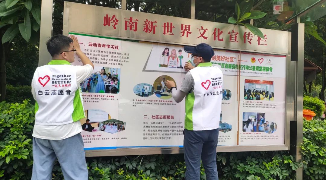 白云岭南新世界社区志愿者更新社区志愿服务宣传栏(广州白云区青年志愿者协会供图 2021年6月24日摄)