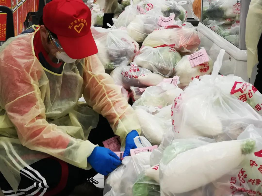 疫情期间,武汉青年志愿者为社区居民分装蔬菜(余惠明 2020年3月摄)