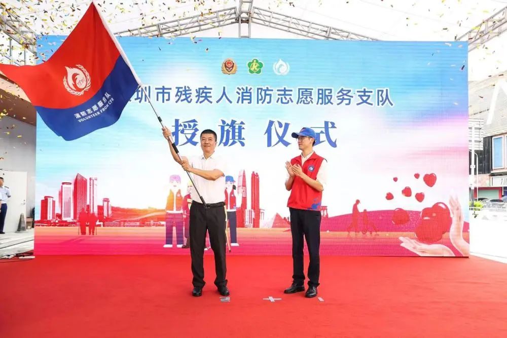 深圳首个残疾人消防志愿服务支队17日成立,深圳市消防救援支队、深圳市残疾人联合会联合深圳市雨燕残疾人关爱事业发展中心举行授旗仪式暨残疾人火灾疏散逃生演练活动。