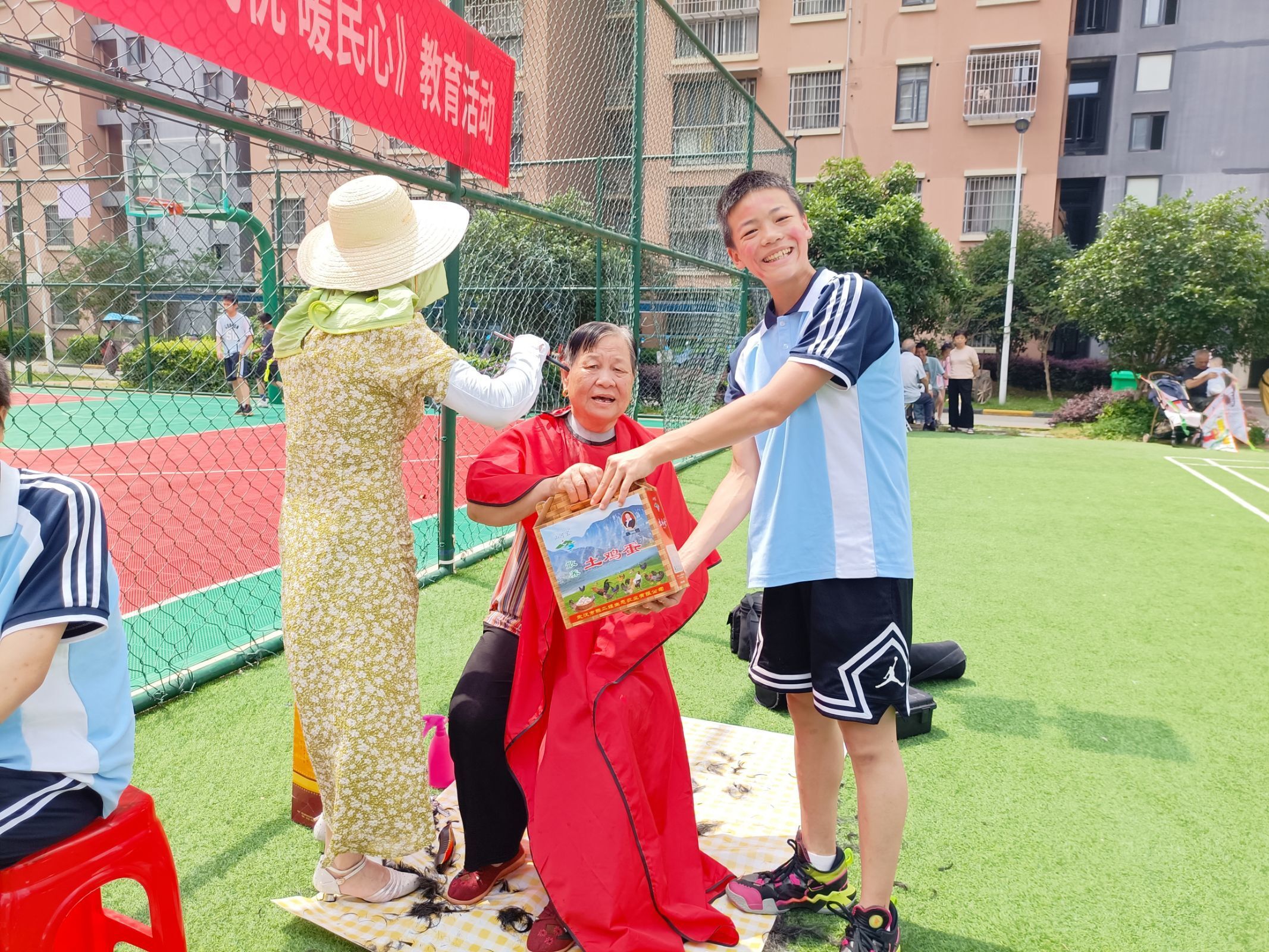 在主舞台区,砺志中学孩子们正在为老人表演节目,有威武的军体拳表演,灵巧的独轮车表演,愉悦的歌舞表演,赢得在场居民阵阵掌声,休息之余,孩子们懂事的为老人们捏肩捶背,老人我握着孩子的手,夸赞连连。流芳社区社会组织二胡队为孩子们带来《敖包相会》乐器演奏,荡气回肠的歌声中带着居民领略过往风光,从红色年代汲取养分,继往开来,争当时代弄潮儿。“孩子与老人的良性互动,学校孩子能够从老人的言传身教中汲取成长养分,老人也能够感受到孩子们的热情活泼,实质上做到联合一老一小,关爱一老一小。”社区居委会张芬说到。