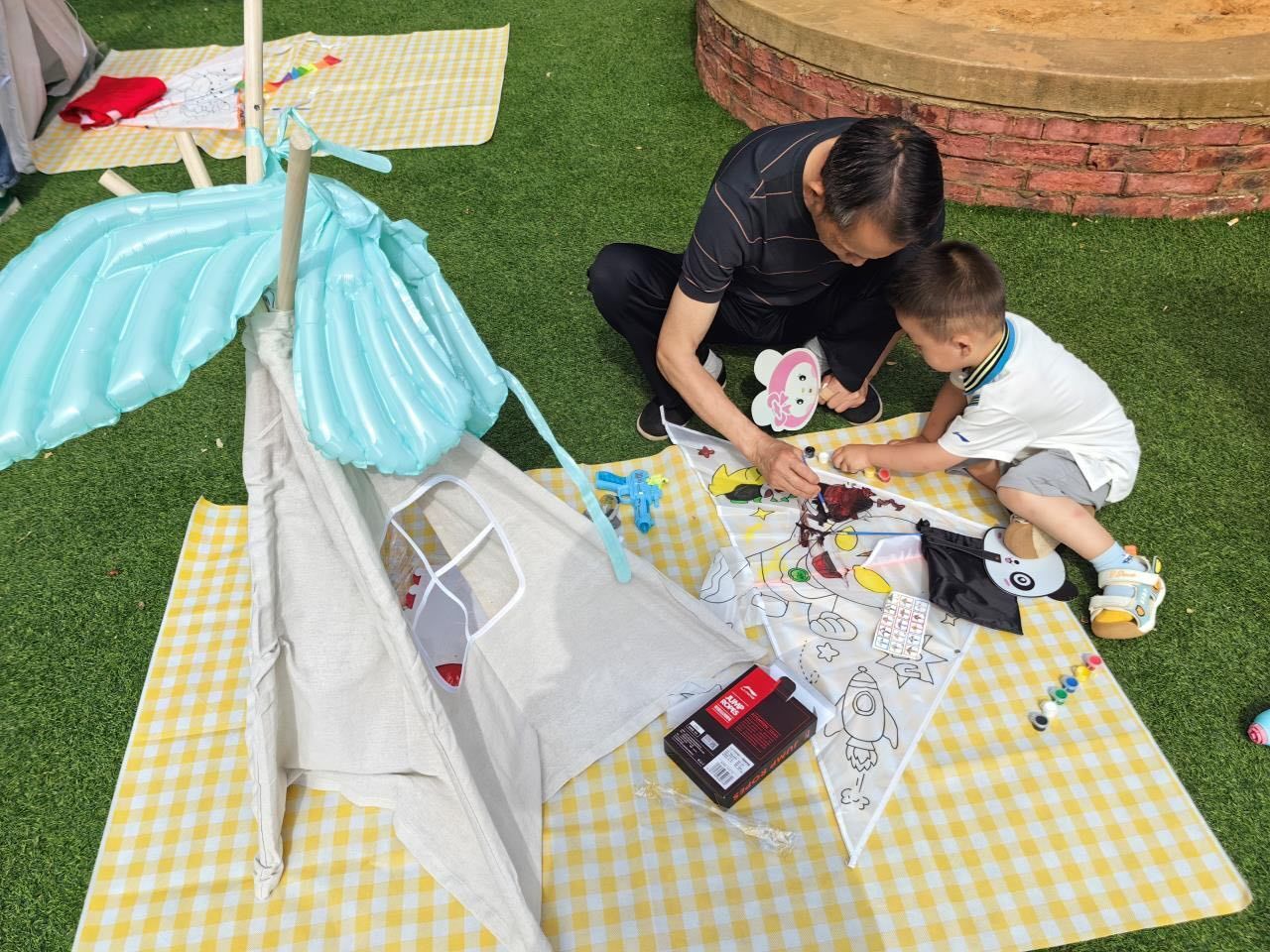 帐篷绘制完毕,孩子们意犹未尽,社工又为孩子们准备了手绘风筝,图案有雄伟壮阔的天安门,有徐徐流动的长江水,还有搏击长空的雄鹰。孩子们手握转轮,社区工作人员、居民与社工搭线引航,像为孩子成长之路保驾护航,风筝在天空飘动,像孩子们的理想自由翱翔。