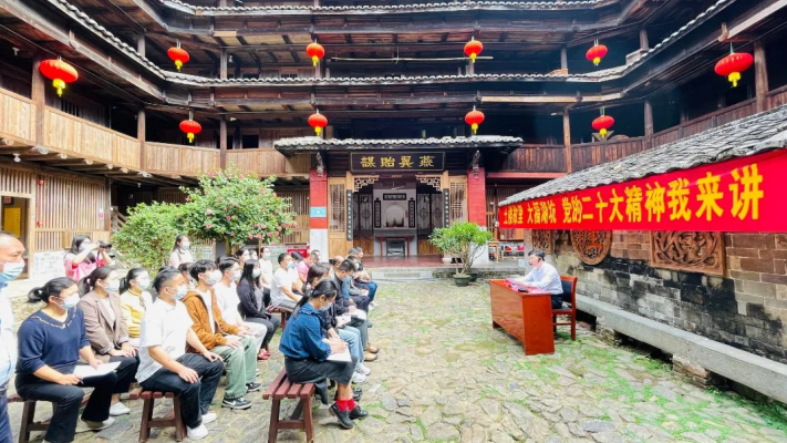 永定区在土楼客家家训馆向游客、土楼居民和镇村干部宣讲党的二十大精神。