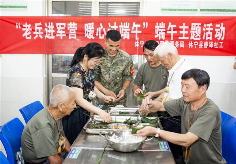 安徽省黄山市休宁县“情暖老兵”志愿服务项目开展“老兵进军营 暖心过端午”志愿服务活动。活动当天,10名退役老兵走进部队,参观军营双拥广场,观看部队训练,与部队官兵一起制作香囊和粽子,感受往昔峥嵘岁月。