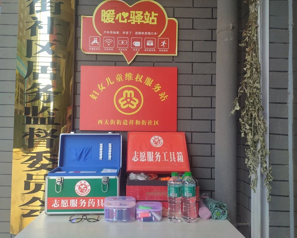 “党建+驿站+阵地”,打造便民“百宝囊” 祥和街社区紧扣新业态群体来源广、流动性强等特点,精心谋划、科学选址,通过党员干部、网格员实地走访、随机调研的方式广泛征求意见,制定暖心驿站实施方案。发挥社区党群服务中心的位置资源优势,将驿站建设成为民服务的“新基站”,配备休息座椅、报刊书籍、医疗急救包、饮水机、打气筒、工具箱、针线盒等便民用品,切实解决新就业群体吃饭难、充电难、如厕难、休息难等现实问题,从提供“小微”贴心服务做起,打造群众身边的“便民休息圈”。