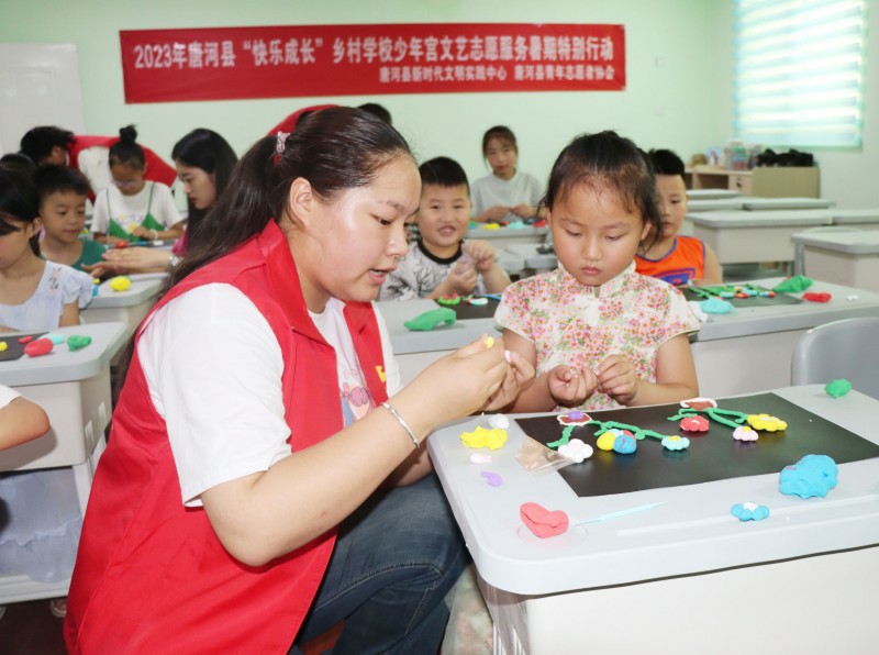 南阳市唐河县新利体育在线官网首页入口中心组织志愿者走进谢岗实验学校,为辖区儿童开展书法、绘画、手工、舞蹈等暑期文艺志愿服务。