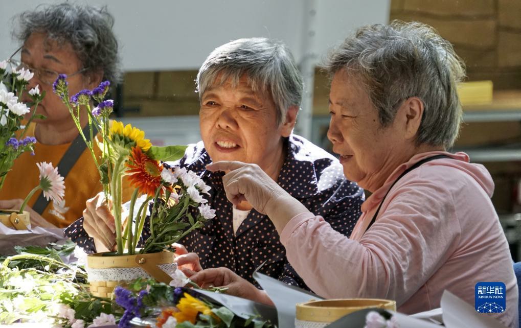 北京市朝阳区劲松街道首城社区的居民在社区新利体育在线官网首页入口所参加插花培训(9月13日摄)。