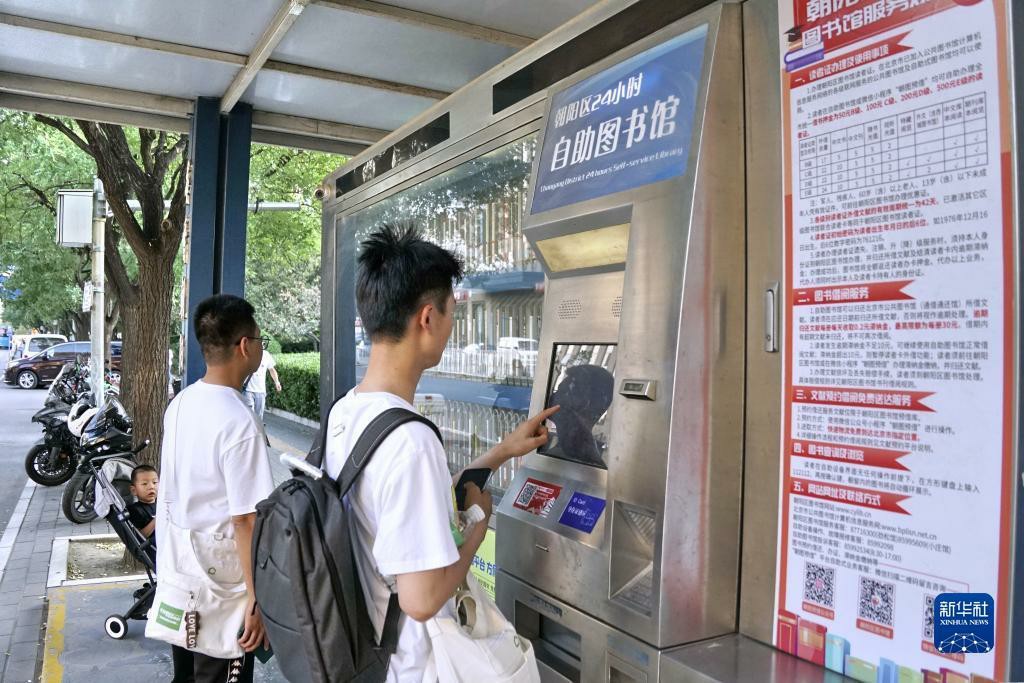 居民在北京市朝阳区青年路的一个自助图书馆借阅图书(9月14日摄)。
