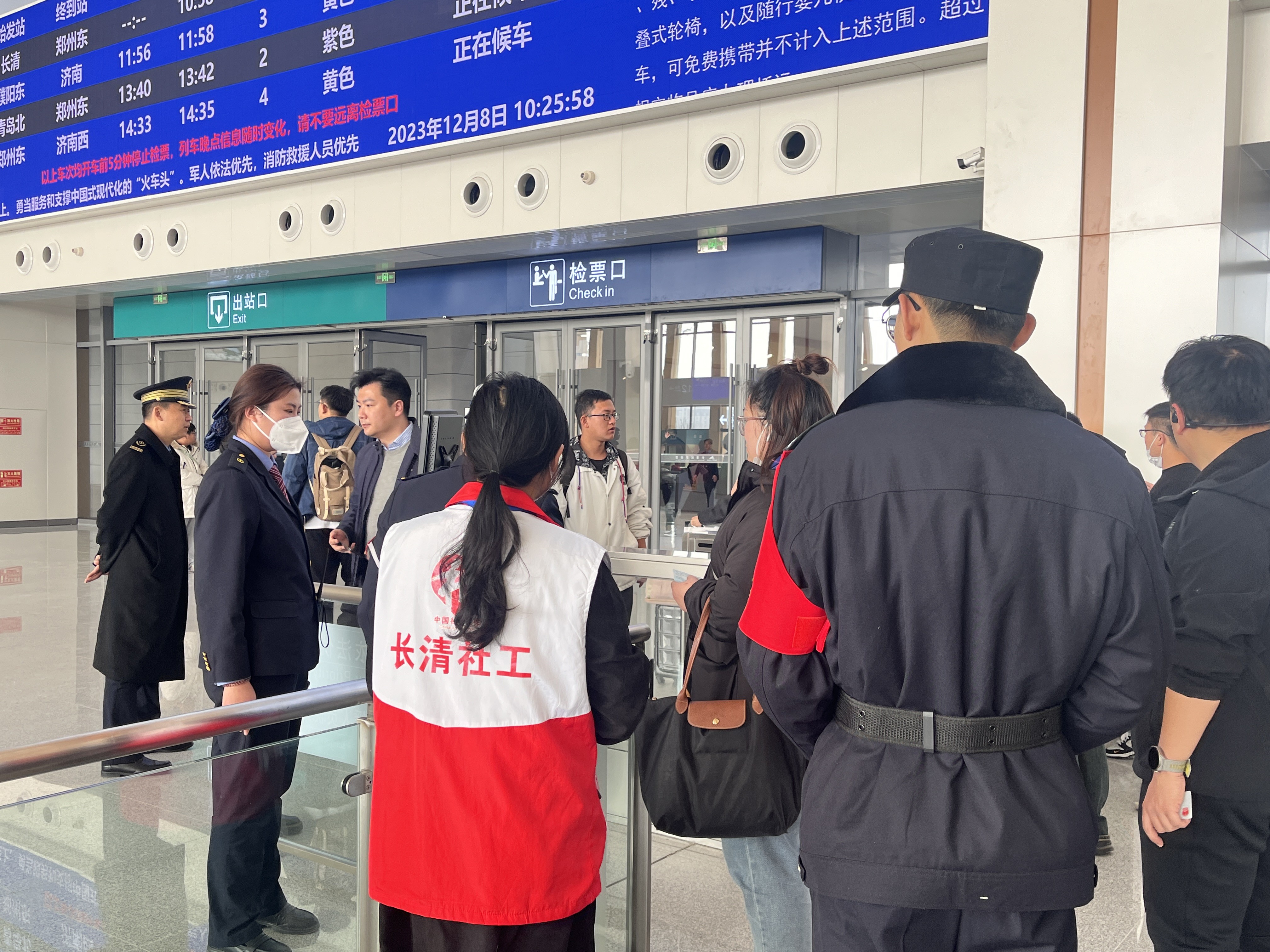近日,济南至郑州高速铁路济南至濮阳段正式通车,标志着济郑高铁全线贯通运营。为加强社工宣传力度,传扬社工服务精神,树立长清社工良好形象,文昌街道社工站发挥社工专业优势,在长清高铁站开展社工服务,进行来往旅客交通疏导,宣传社工服务,在现场留下社工“一抹红”的印迹。