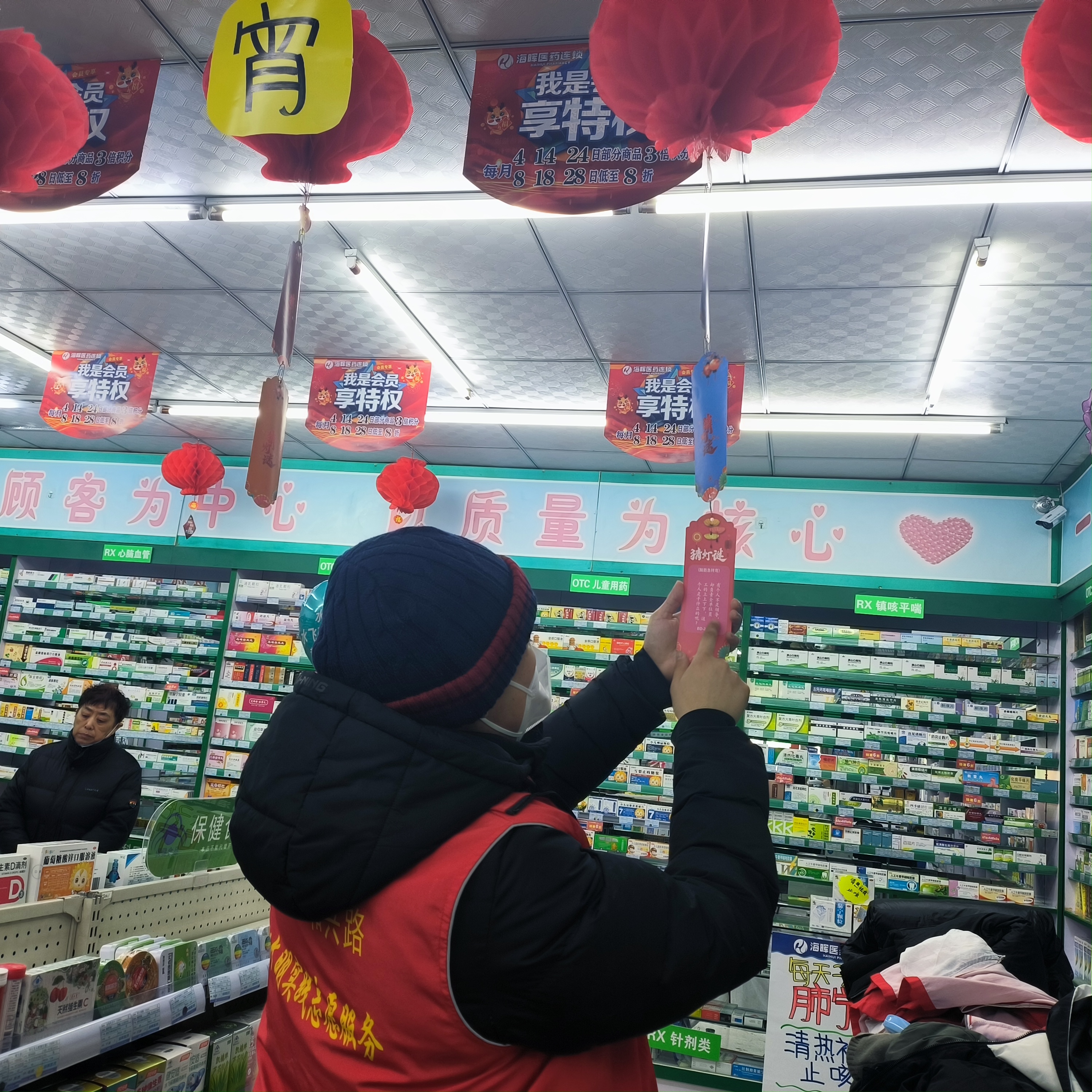 在猜灯谜环节,药店的工作人员备了一些与药品、健康知识相关的谜题。居民们或低头沉思,或相互讨论,或灵光一闪豁然开朗。猜中谜底的居民还能获得药店精心准备的小礼品,现场气氛既紧张又欢乐。