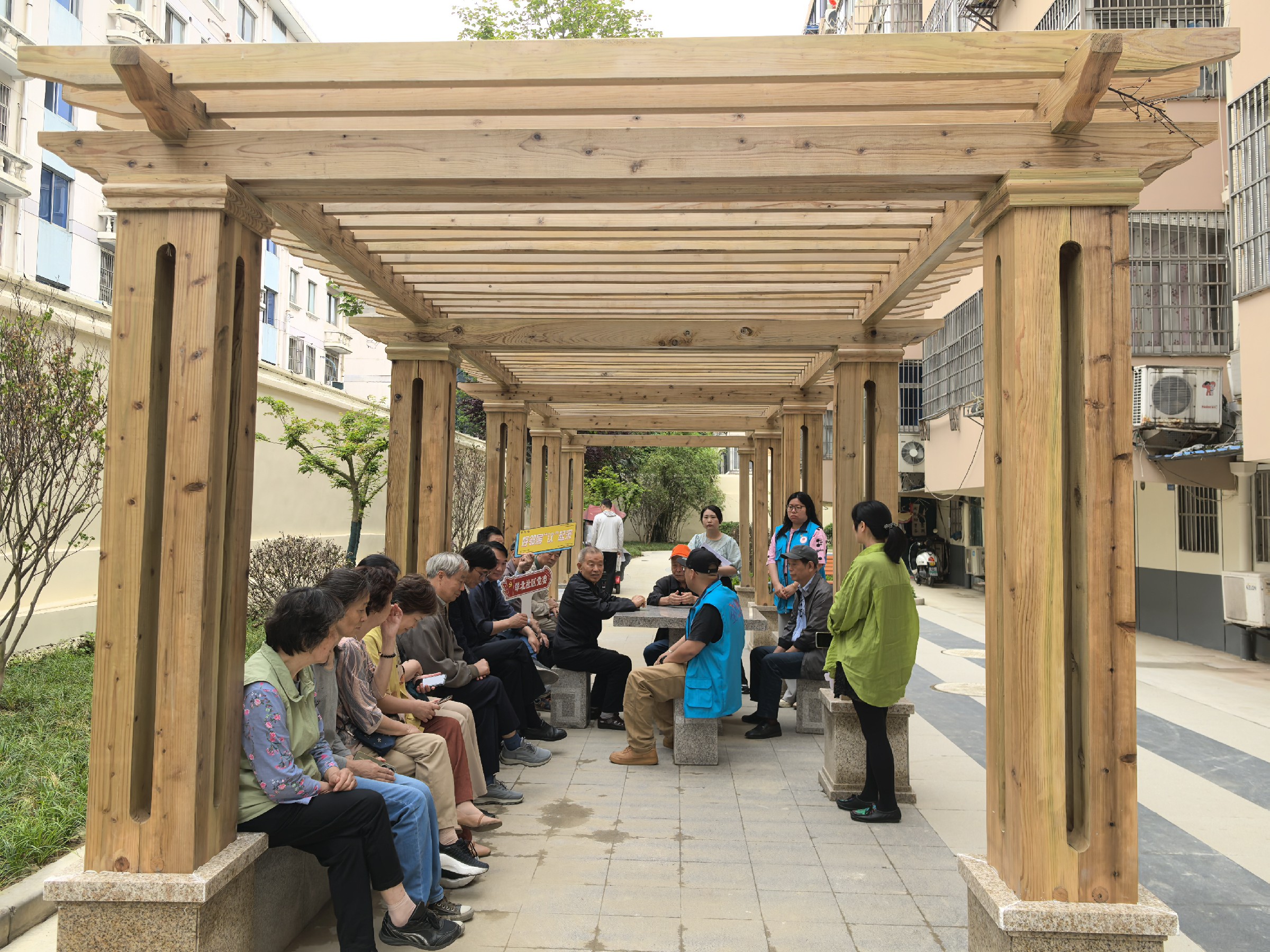 除此处之外,小区的其他三个文化廊亭也已经原地翻新,社区因地制宜打造“沉浸式”社区治理议事空间,将“家门口小板凳”议事会升级成“家门口亭廊”议事会,实现改造“更新”,品质“提升”,幸福“升级”。