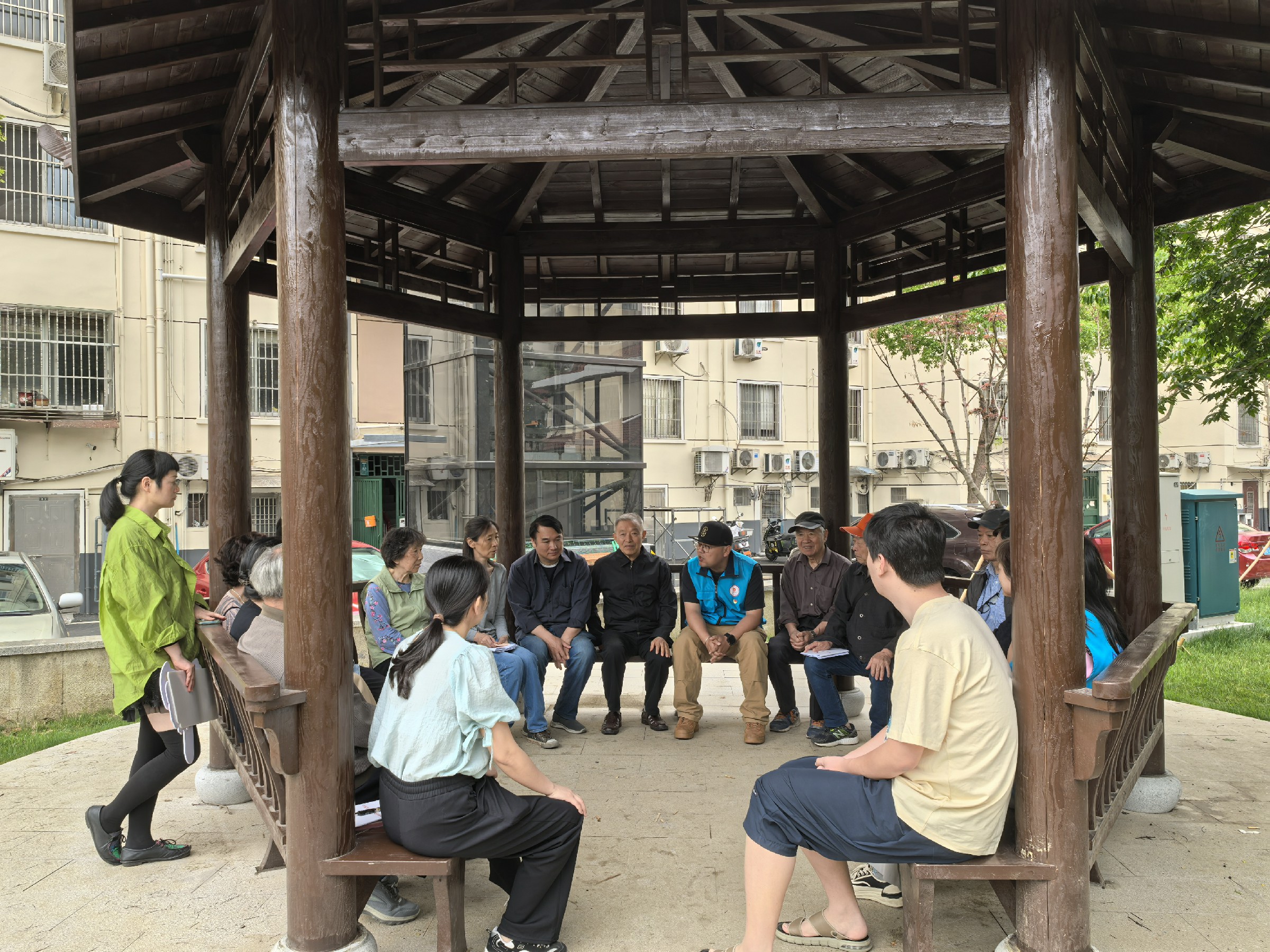倾听群众心声 闲置空间改游憩空间 在小区内部打造一批景观小品、花台、廊亭是老旧小区改造的重点项目之一,通过社区中心广场的紫藤阁、休憩亭、148幢门口的环岛健身广场和187幢南面绿化带四个区域的改造提升,重塑社区文化与居民间的情感联系。而居民对187幢南面建造廊亭和绿化提升方案却呈现了两种不同的声音。