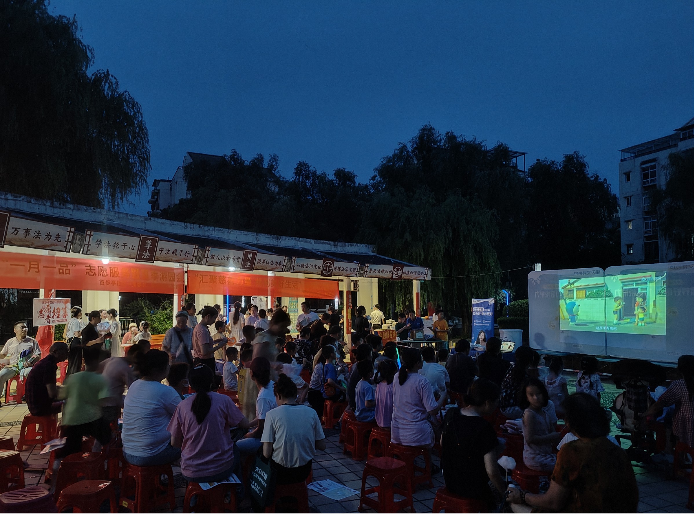 7月19日,湖北省武汉市江岸区百步亭社区一居委会组织开展“学雷锋一月一品志愿服务活动”暨“夏季游园会”。居民、志愿者、爱心商户欢聚一堂,看电影、拉家常。