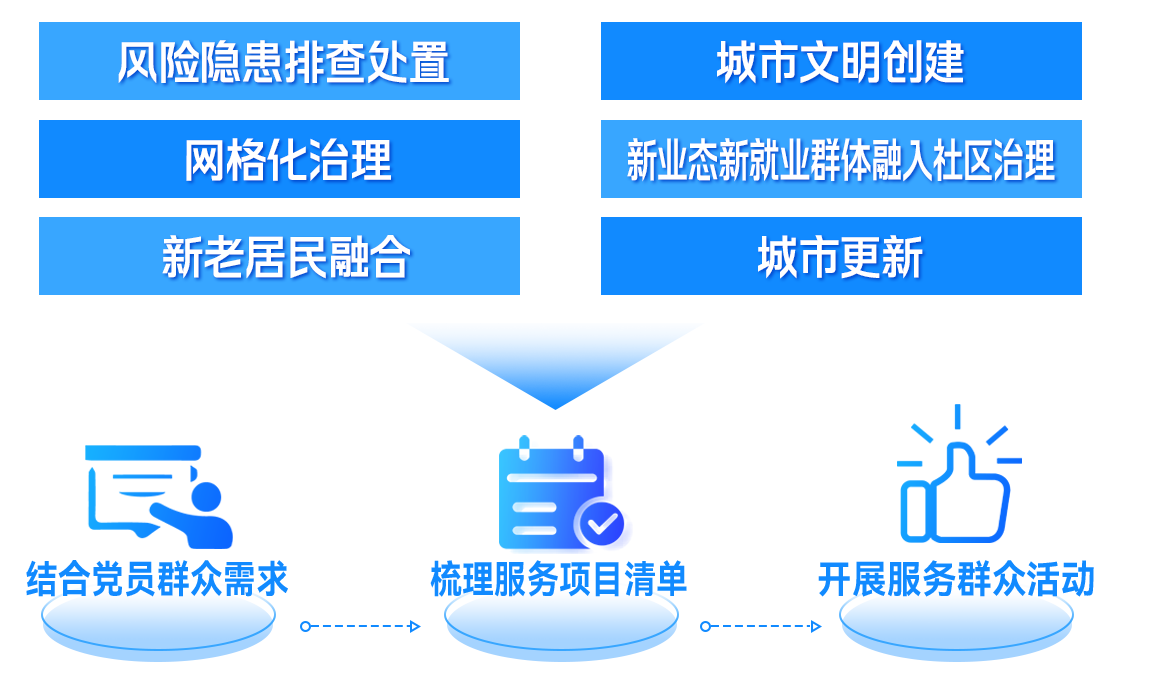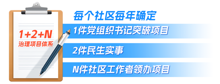 领办一批社区治理服务项目。构建“1+2+N”治理项目体系,即每个社区每年确定1件党组织书记突破项目、2件民生实事、N件社区工作者领办项目。围绕风险隐患排查处置、城市文明创建、网格化治理、新业态新就业群体融入社区治理、城市更新、新老居民融合等工作,结合党员群众需求,梳理服务项目清单,开展一系列服务群众活动。采取“撬动社会资源+挖掘社区内生资源+盘活社区阵地资源”的方式,吸纳社会组织入驻社区,保障社区治理服务项目落地见效。