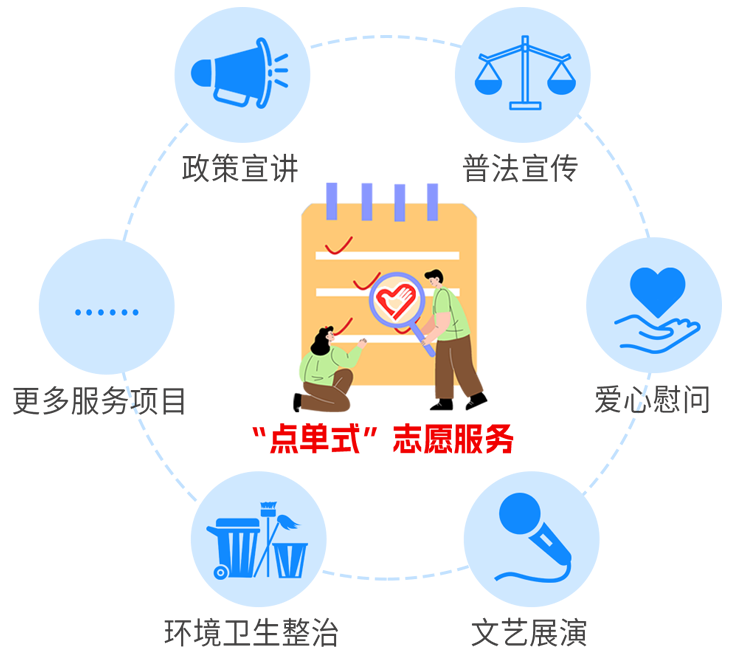 打造一支志愿服务队伍。把社区作为志愿服务的主阵地、主场景,建立健全多方联动、共同参与的“党建+志愿服务”工作机制,积极探索志愿服务精细化运作路径,提供“点单式”志愿服务,激励社区工作者发挥模范带头作用,引领社区党员志愿服务队常态化开展政策宣讲、普法宣传、爱心慰问、文艺展演、环境卫生整治等志愿服务活动,进一步丰富群众精神文化生活。