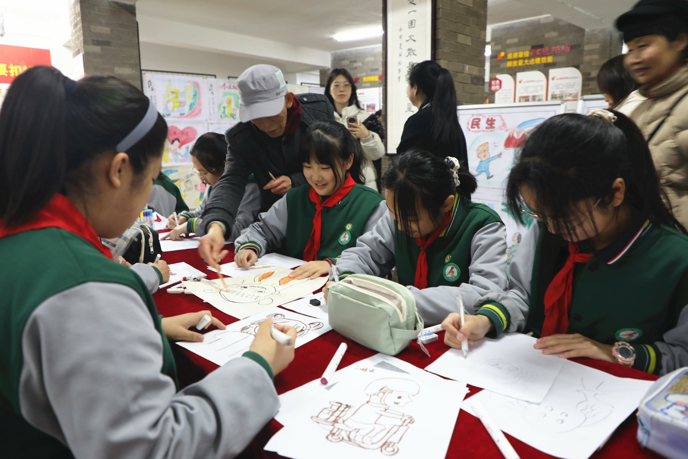 “漫画达人”王景民和非遗传承人潘长鸿指导学生动手画漫画。“漫画不仅是画图,更要讲故事,漫画‘扣好人生第一粒扣子’就是希望你们迈出第一步、走好人生道路。”王景民鼓励学生用画笔记录生活,用艺术表达自我。