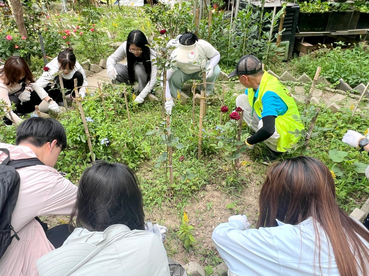 “对,捏住底部,垂直向上发力!”“动作轻点,稳点,‘宁可慢,不可伤’!”两位园艺师指导大家戴上手套,认真辨识杂草,小心翼翼地拔出根部,驿站一角变成热闹的“园艺实战课堂”。