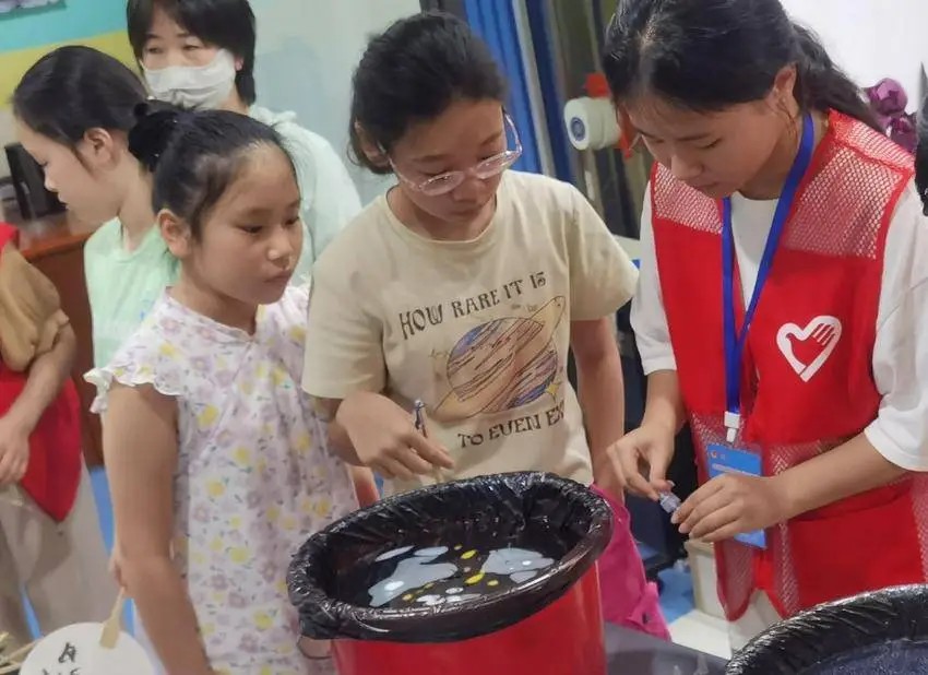 “大漆是中国特有的一种树脂涂料,具有防水、耐腐蚀、光泽持久等特点,将调制好的漆液滴入水中,利用漆不溶于水的特性,使其在水面自然晕染,形成流动纹路,获得独一无二的扇面。”7月18日,幸福时代青少年空间的特色自筹课堂上,30多名学员在志愿者的指导下学习漆扇工艺,在“家门口”感受传统文化的魅力。